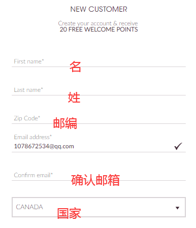 第一次在欧缇丽加拿大官网购物的朋友需要先注册账户,点击CREATE YOUR ACCOUNT输入邮箱开始注册;