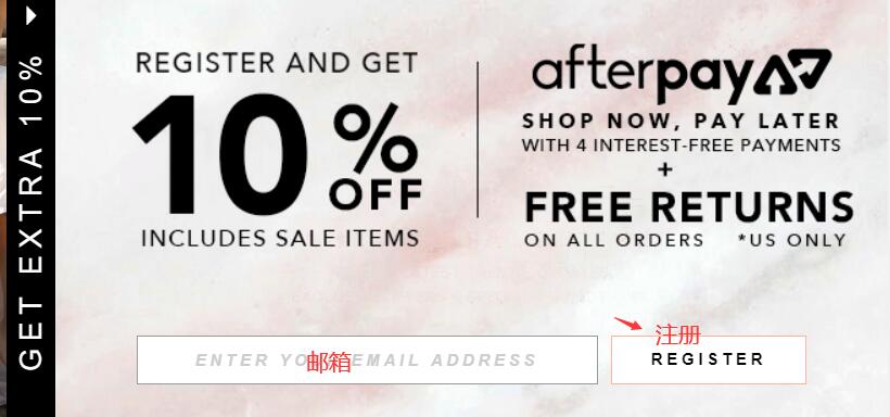 1) 先在商家右侧边缘找到如图,新用户进行注册可获得额外9折优惠,优惠码会发送到你的邮箱里。