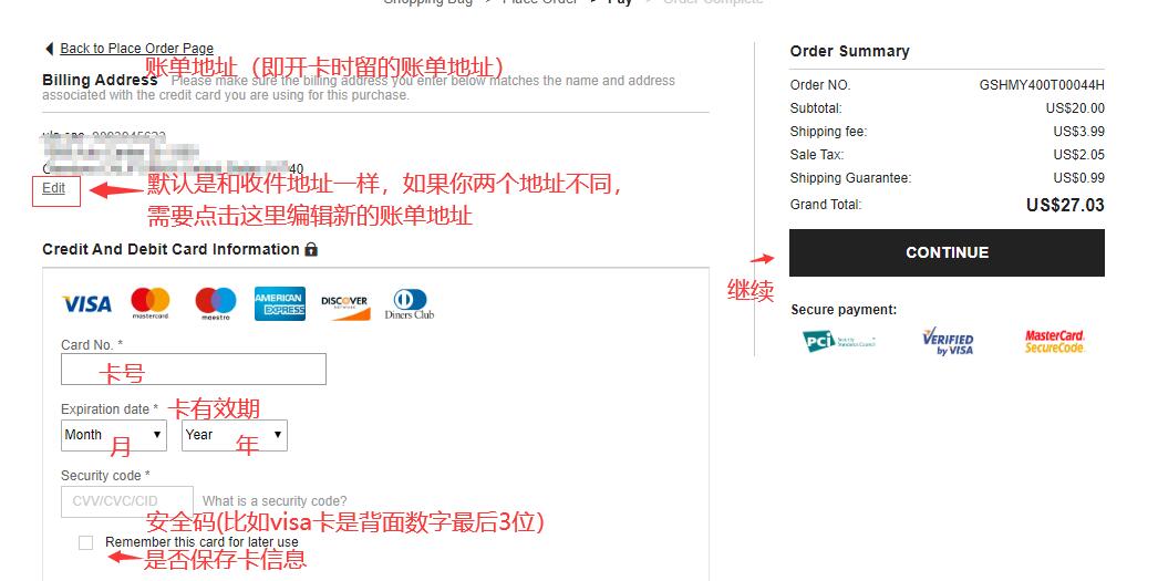 3) 确认账单地址信息& 填写信用卡信息,最后点继续下单